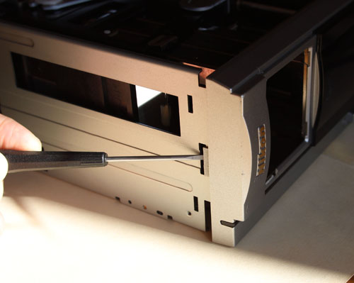 13) Remove the front panel by gently prying the plastic tab near the top of the scanner. Be careful - these are fragile.