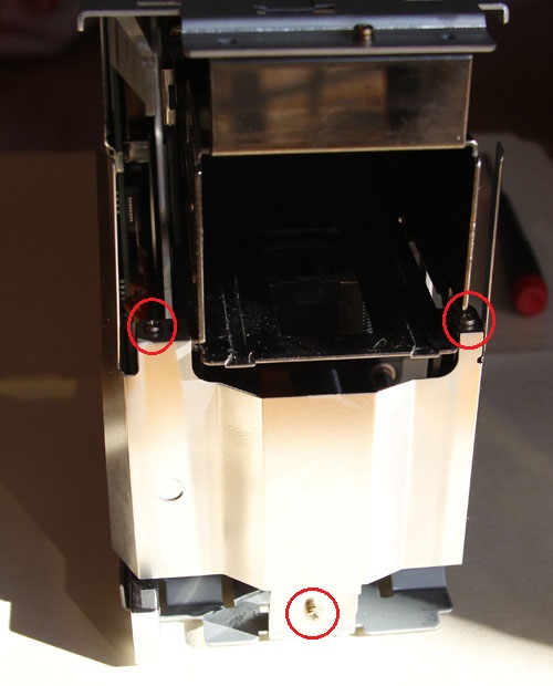 1) Unplug the power & Firewire cable and remove adaptors. Set the scanner upside down on a clean area. Set it upside down if you are planning to inspect/clean the mirror.