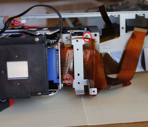 16) The big black part labeled PC-GF20 is the LED source. This parts sometimes fails. The good news is that the same part is used for LS-40 (aka IV), LS-4000, LS-50 (aka V), and LS-5000. So you can buy used LS-40 on e-bay and have a fairly inexpensive replacement part. The bad news for LS-4000 owners is that you have to disassemble it this far to get to the LED source. Nikon modified the design for LS-5000 so you do not need to go nearly this far in disassembly to be able to replace the LED source. If you are repairing the scan head gears, proceed by removing the two black screws above and taking the film conduit out.