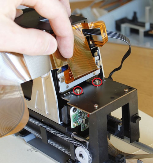 19) Gently pull the scan head out. Careful to feed the flex cables to make sure they do not get damaged.