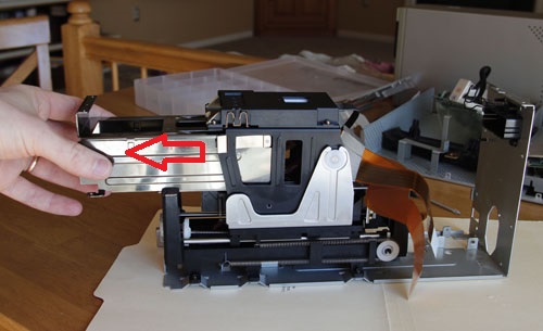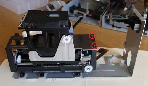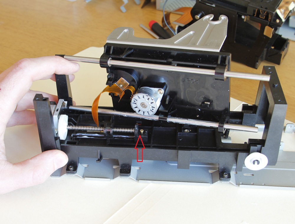 22) Almost there! Remove 4 screws and the spring indicated by the red arrow. Lift the carriage with the guide rods.