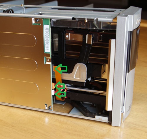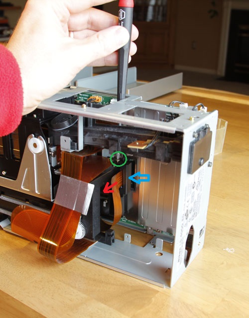 5) Remove these 5 screws (4 circled and one on the back panel - red arrow above is pointing at it). Unplug the black 8-lead cable connecting the power supply to the main board and lift the power supply out. First disconnect it from the plastic power arm at a point indicated by a green arrow - just pull that side power supply up while holding the black side with a screwdriver. After that remove the plastic isolation cage out as well.