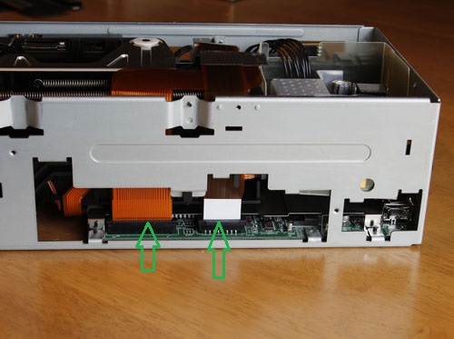 6) With power supply and plastic cage out, you can see the back of the main board and a flex cable connected to the center of the main board, as shown above. You will need to disconnect all cables connected to the main board. Some of them are simple Molex connectors, some are flex connectors. Be careful when disconnecting the flex cables. To disconnect the flex cable, you need to pull up the pressure bracket first, and then gently pull on the flex cable. You never need to apply much force with flex cables - and make sure you do do not!