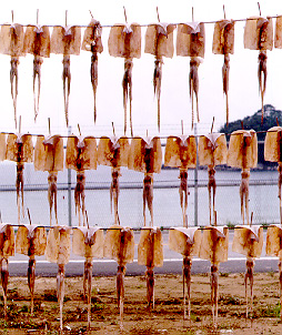 это вяленый кальмар. Очень вкусно. Картины сохнущих стройными рядами на