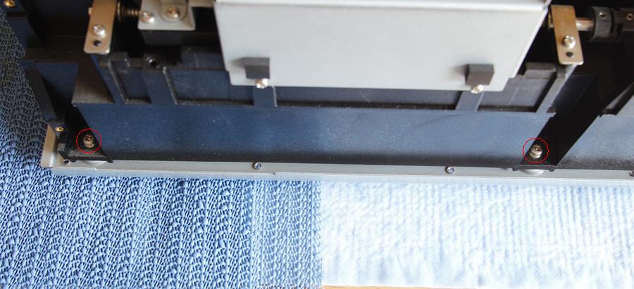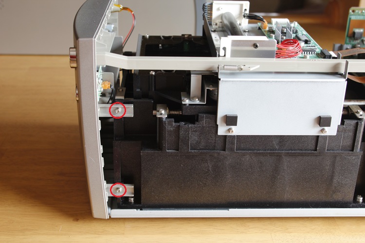 4) Remove the 2 screws (holding the front panel) indicated by red circles. Turn the scanner around and remove 2 more screws from the other side.