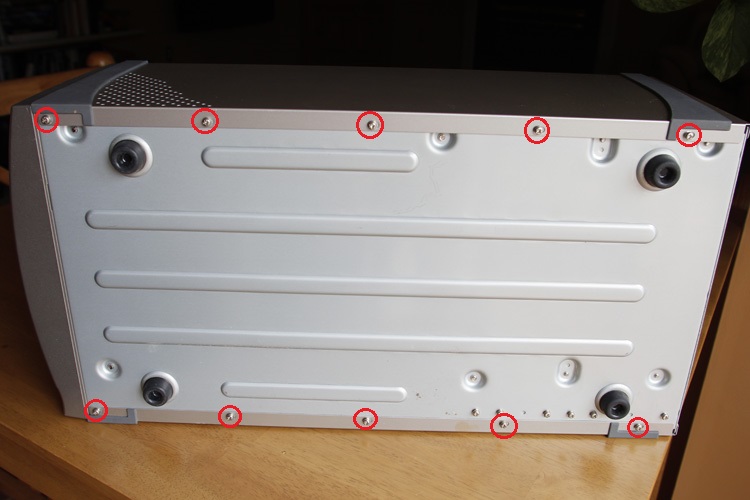 3) Remove these 8 screws on the bottom and slide the metal shell off.