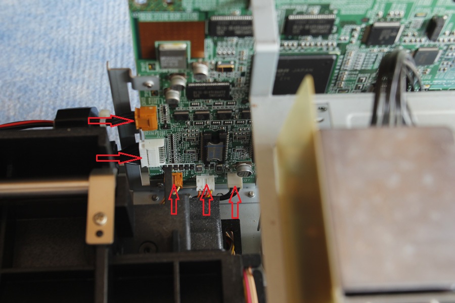 9) Disconnect (gently wiggle to pull out) five connectors indicated by the red arrows. It may be easier if you slide the optical assembly a little bit.